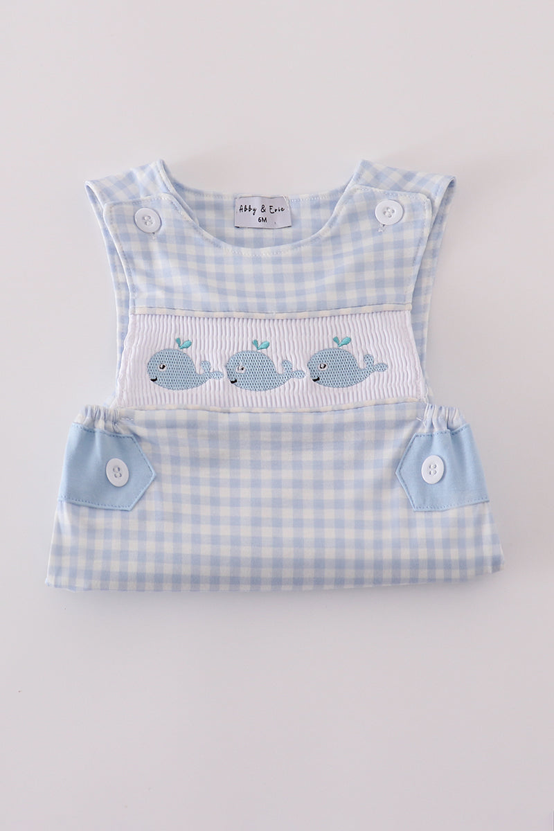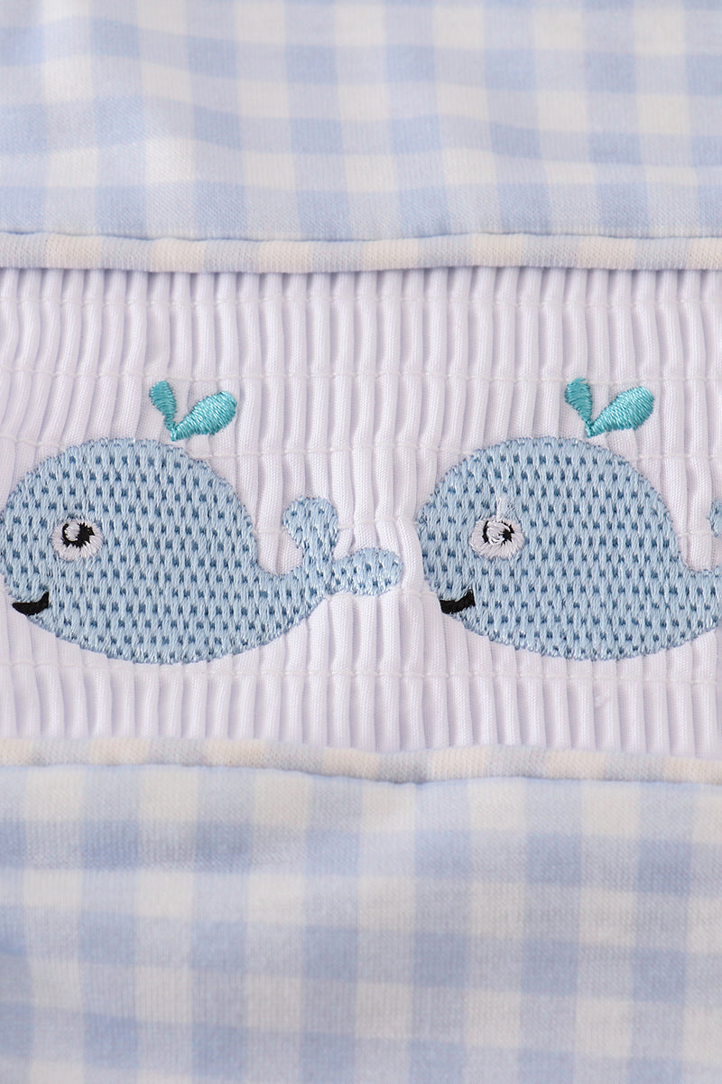 Get ready for some whale-y good fun with our Blue Whale Embroidery Smocked Jonjon! This adorable one-piece is perfect for your little one with its playful blue whale embroidery and comfortable smocked design. Made with high-quality materials, it's the perfect blend of style and comfort.